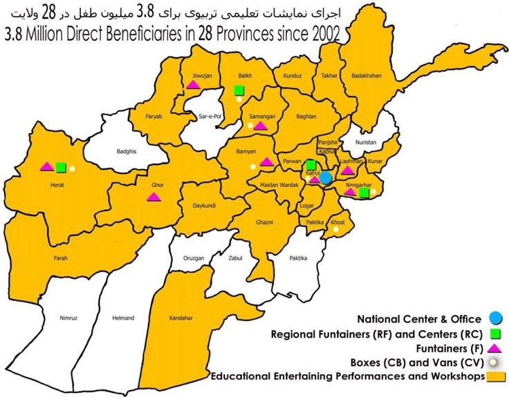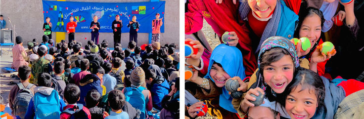 アフガニスタンの現地NGOは、この23年で、28州400万人の人々に、文化芸術活動を通じた様々な教育プログラムを提供してきました。当初より、識字率の低い辺境の村々を回り、演劇や、歌などを通じて、子どもたちに衛生教育、人権教育、平和教育、地雷回避教育など、国連や各国政府の委託を受け、活動をしてきました。