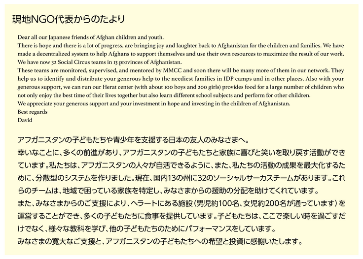 本年も、アフガニスタン国内をとりまく治安や経済環境は決して良くなったとは言えず、引き続きの支援を必要としています。