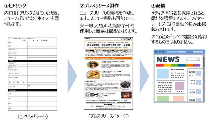 PRSJ(公益社団法人日本パブリックリレーションズ協会)認定のPRプランナーが、情報のヒアリングからプレスリリース原稿の作成、配信手続きの代行まで一括して行います。