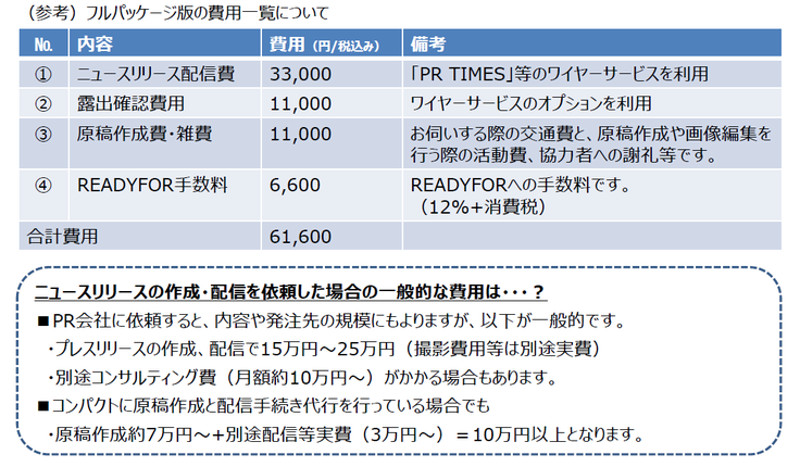 飲食店のお役に立ちたいという想いからスタートしていること、今後の活動に向けたテストマーケティングとして考えていることから、ほとんど必要経費のみで実施いたします。