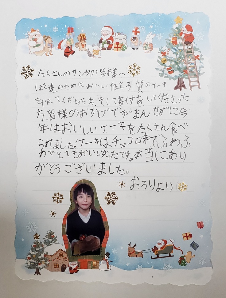 子どもたち達に配るものと全く同じクリスマスケーキをお届け!後日子どもたちからのメッセージを郵送いたします!