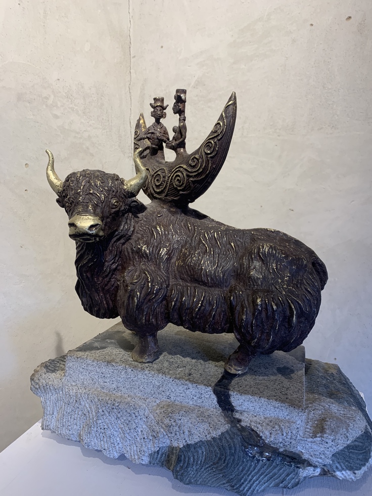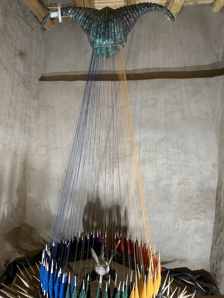 金属や石を使った彫刻や、糸を使ったインスタレーションを手掛ける。最新作は、16フィートもある大きな作品だ。彼のスタジオを案内してもらう。昔、ラダック王家に支えていた占星術師の家をリノベーションし、今はアートスタジオやギャラリーになっている。