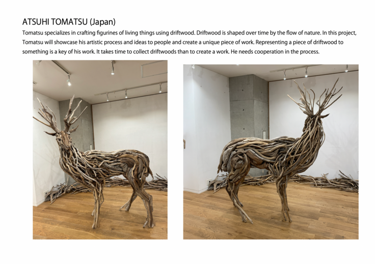 「それは素晴らしいね。例えば流木を集める富松さんチームの作業も、労働者を雇えば事足りると思いますが、アーティストが関わる機会になることで、そのプロセスの中で、お互いに学び合うことができる。そのうちに流木で何か作ってみたくなるかもしれないね。よし、何人が、何日間必要そう?」とこれまたこちらの意図を汲み取ってくれる。具体的に話を伝え、作成したアーティスト紹介カードを渡す。これで情報を受け取る方もイメージがしやすいはずだ。