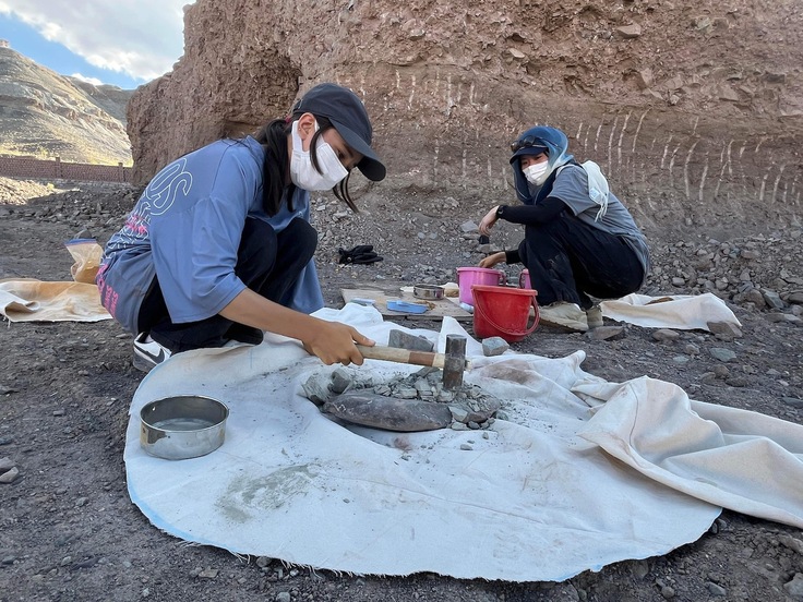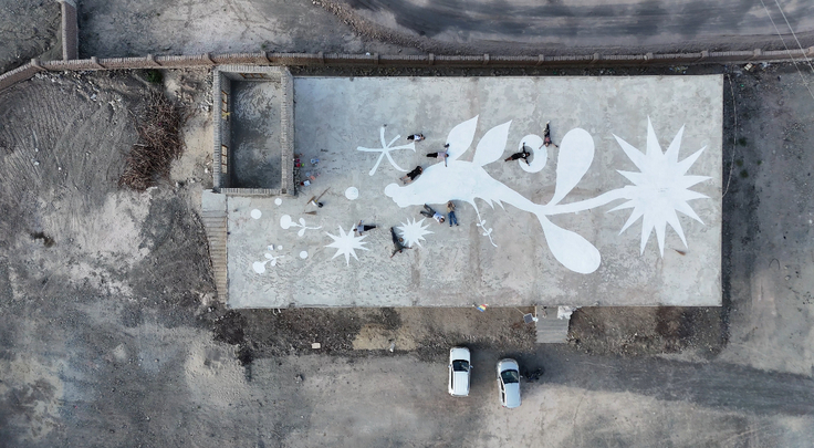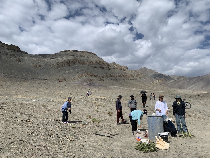 淺井裕介さんがラダックの大地に描く地上絵の一つは、遊牧民のテント素材の帆布をキャンバスに、現地の土とアクリル絵の具や水性ペンキなどで描かれます。2日間の展示後は強風や雨を考慮し、すぐに撤収。最大級にして世界最速で消えてゆく地上絵となります。