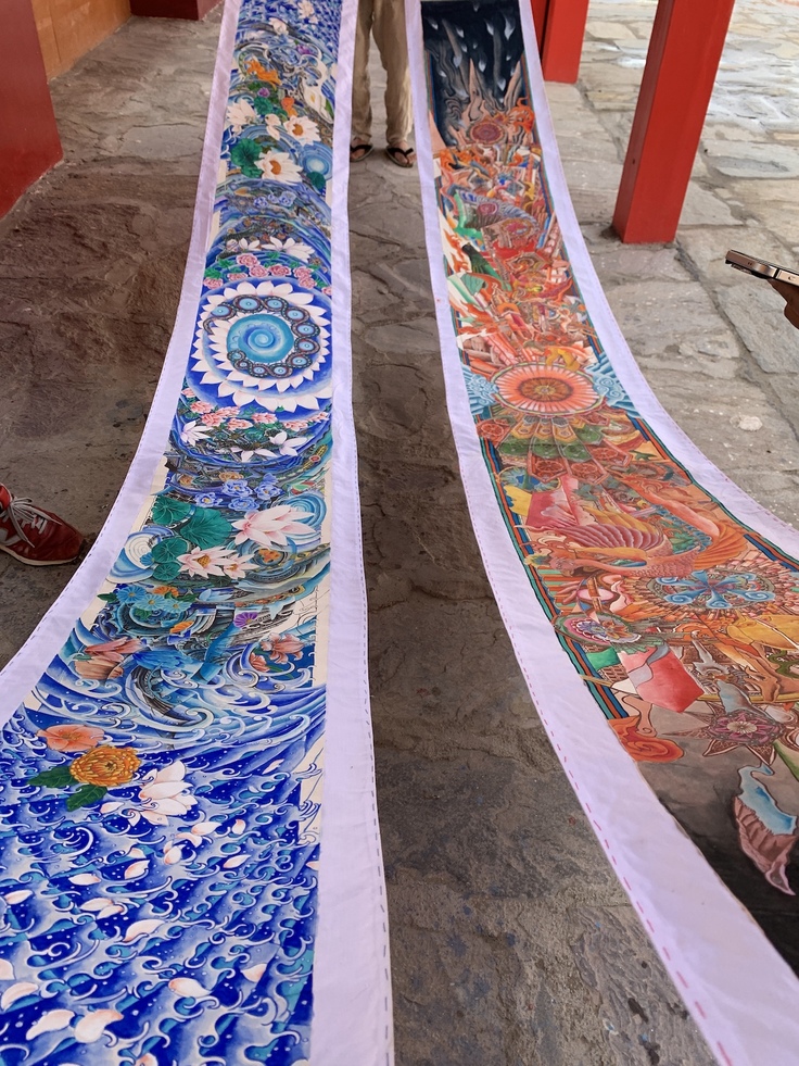 香川大介さんのマトー寺院での制作も佳境に入りました。「火の巻」「水の巻」2本の巻物が既に完成。