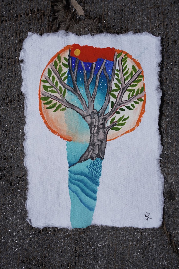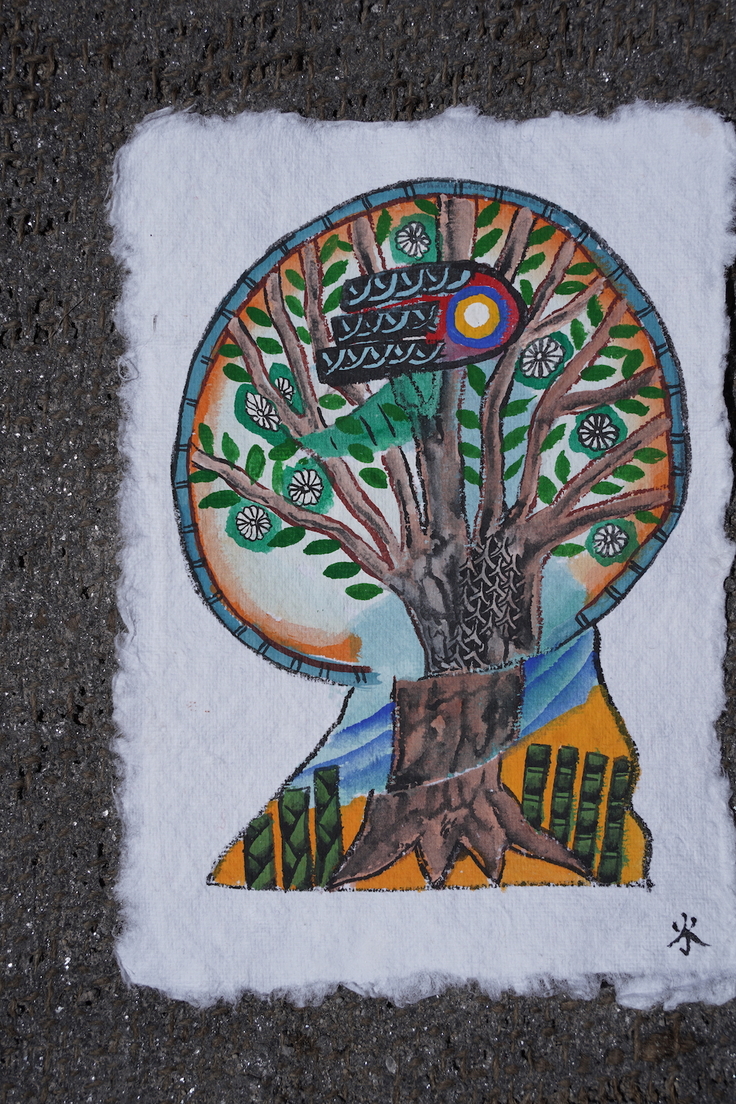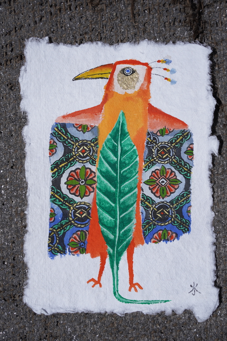 縫製の時に出るコットンを集め、融かし、手すきにした「コットンペーパー」をキャンバスに、絵巻物の制作中に脳裏によぎった光景が描かれています。