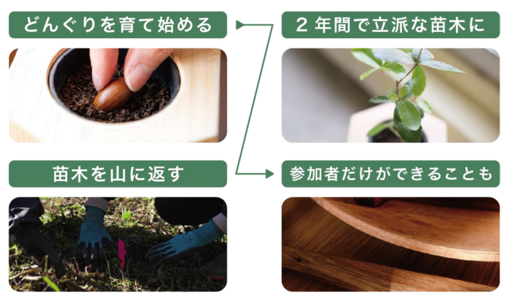観葉植物としてどんぐりを家やオフィスで育てて、一定期間育ったどんぐりの苗を山に植林するという取り組みです。
