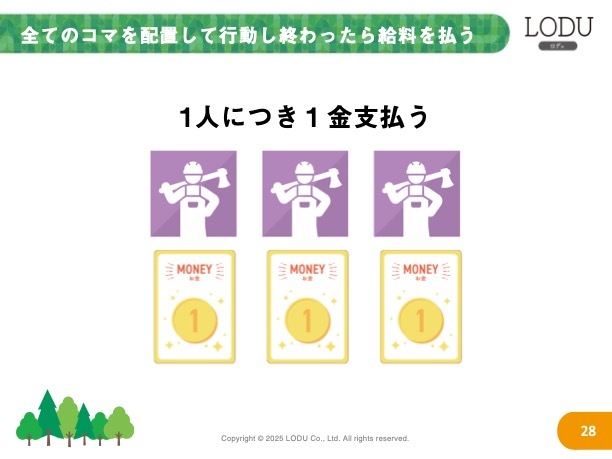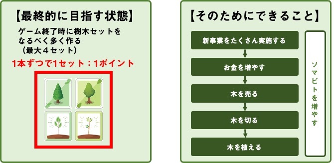 この樹木セットを作っていくために、プレイヤーは、植林したり、木を伐採したり、伐採した木を販売したりしていきます。