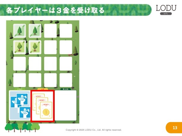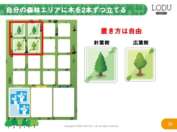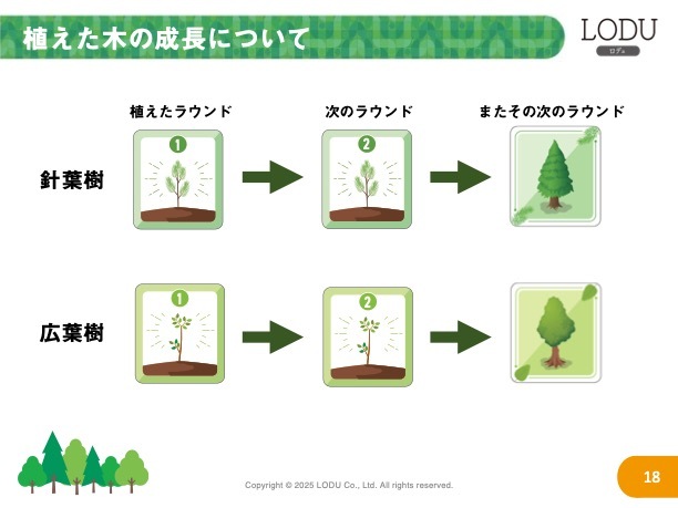 当たり前のことですが、木を切って販売していくだけでは、未来の資源は枯渇していきます。このゲーム中でも未来に資源として木を使っていくために、継続的に苗木を植林する必要があります。苗木を植林することがゲームの勝利条件にも大きく関わってくる仕様になっています。