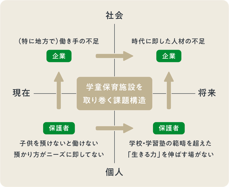 また、学童保育立ち上げの準備を進めていくなかで、学童保育がさまざまな社会課題の鍵となっていることにも気がつきました。