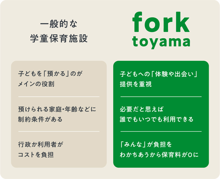 それらの施設を利用したり、代表の岡山をはじめとしたいろいろな専門領域をもつプロフェッショナルからのサポートを対価とした会員制度をとることで、その会費によって学童保育の運営費用を賄う=子育て世帯の負担をゼロにする仕組みです。