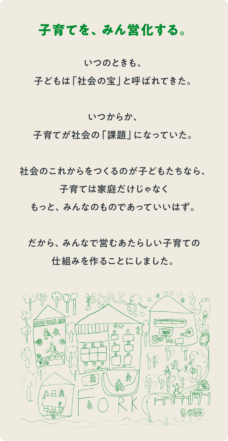 保護者だけが子育ての負担を背負うという今の当たり前を、立場も、住む場所も、子どもの有無もすべて関係なく、子どもを軸に力を合わせ、「みんな」で運営する新しい子育てのあり方を形づくりたい。そう考えています。