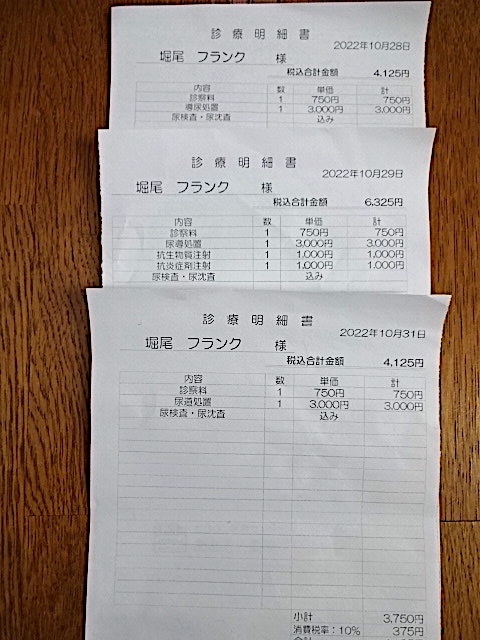 10/29 かかりつけ病院 導尿処置,抗生物質注射,抗炎症剤注射 6,325