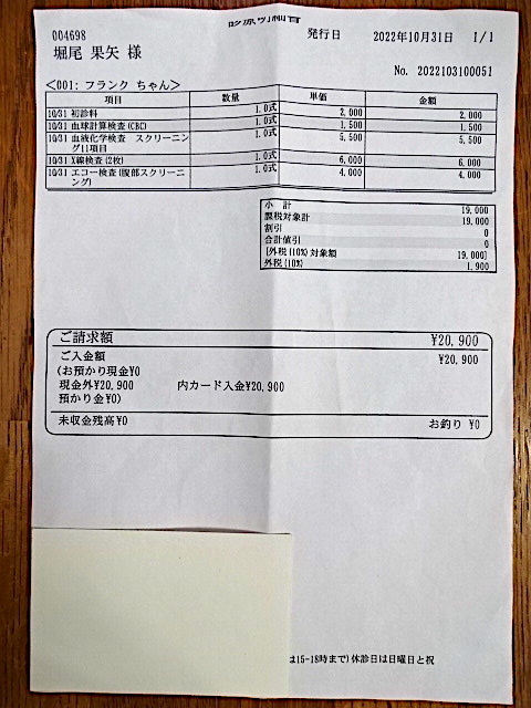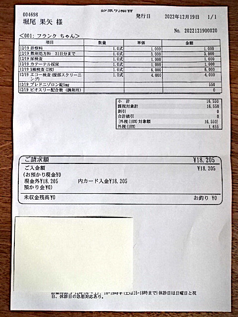 入院して一旦、退院しました。(今回の検査入院費12万円とは別途、次の手術費用と予後2日分の入院費併せた見積もりが約50万円と通常の3倍ほどの高額費用の為、現実的に無理で、やむを得ず戻りました)
