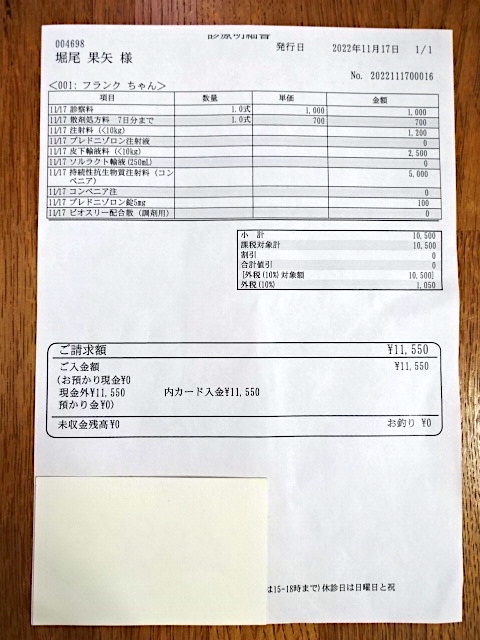 注射料1,200(プレドニゾロン) 持続性抗生物質注射料(コンベニア)5,000 合計11,550