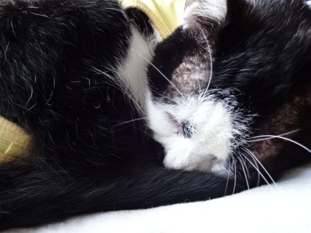すぐに外れてしまうため、1日一度病院へ行って付け直したり輸液したりと、7日間の臨時出費(1日約1万円〜2万円)も増えていきました。その間に 並行して、皮膚の状態が悪くなりつつあります。