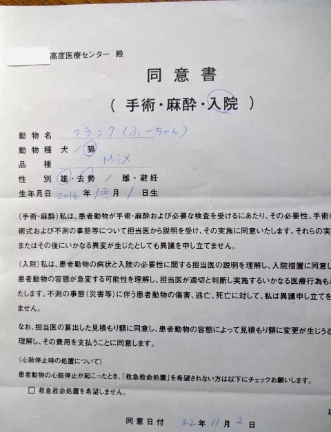 万が一、治療中に亡くなってしまった場合も返還はせず、これまでの闘病代に充てさせていただきます。(記入が義務とされています)