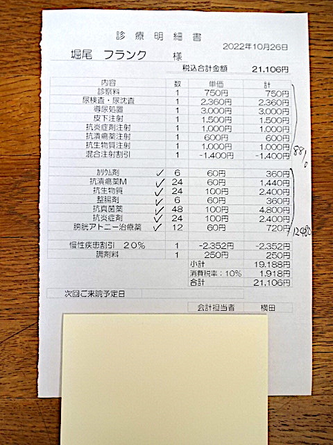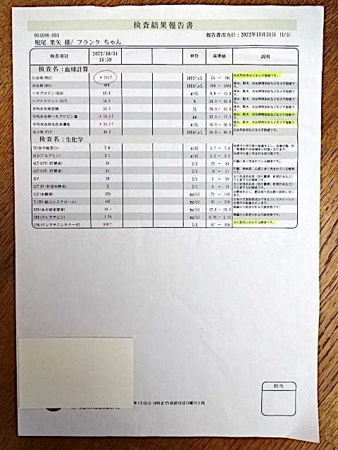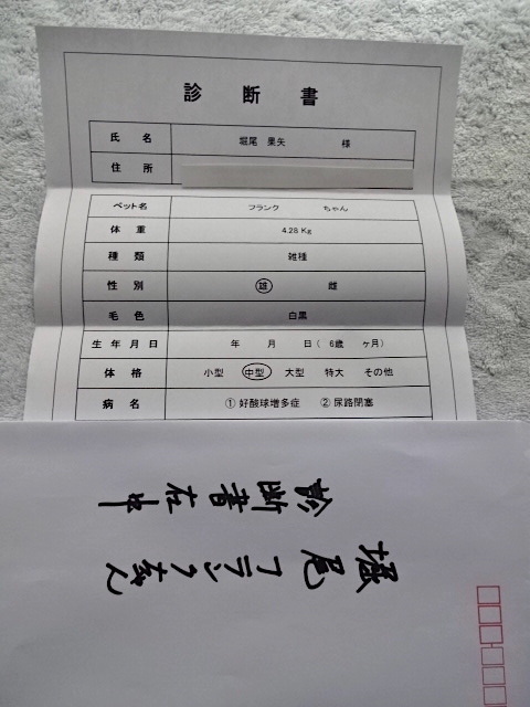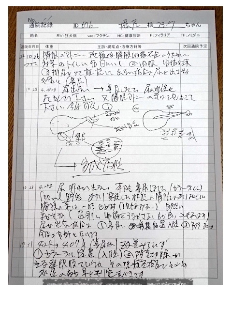 10/26 かかりつけ病院 尿検査 尿沈査 導尿処置 皮下注射 抗炎症注射 抗潰瘍薬注射 抗生物質注射 等