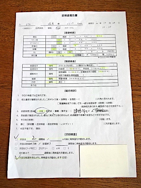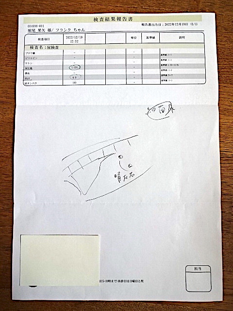 尿検査では、これまでなかったバイ菌が見つかりました。細菌尿というらしいのですが、これは抗生剤で抑えるのですが、ステロイドが原因のこともあるそうで、これも経過を見ていくということで、今回は出されていません。新たなこの2つの問題点により、頻尿など症状が出たら、随時 報告 通院することになっています。