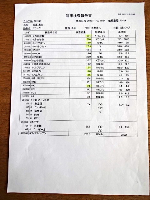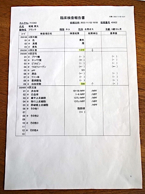 好酸球の方は、アレルギーの療法食から尿石の療法食に切り替え、投薬のみで様子を見て調整していきます。
