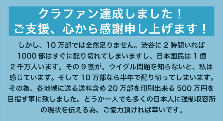 また、自分の力だけで20万部を配り切るのは、とても難しいミッションです。その為、日本全国で小冊子を配る行動が広がれば良いなと思っております。ご支援と共に、小冊子配布に関しても、ご検討頂ければ幸いに存じます。毎日の様に強制収容所ではウイグル人が殺されており、一刻も早く強制収容所を解放しなければなりません。時間が無いという事もご認識頂ければ幸いです。