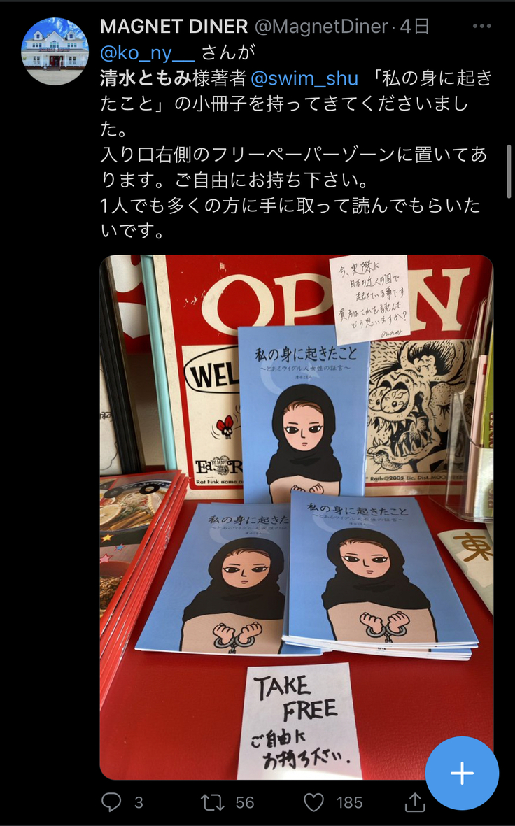 東京のウイグル料理店「シルクロードタリム」が小冊子を置いて下さいました。お店の関係者の皆様に心から感謝申し上げます。