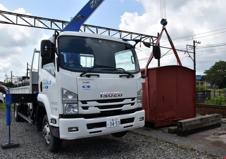 7月22日朝から、ユニック車をレンタルして車体を上げていきますが、片方ずつ枕木をかませて、少しずつ上げていきます。