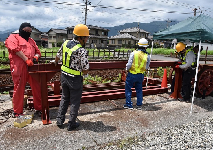 枕木が足りないので、架台の鉄骨部材も使って上げていきます。