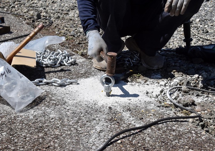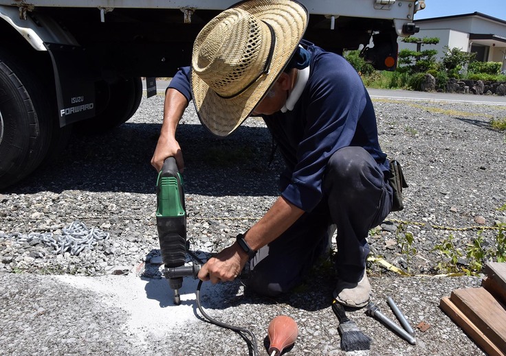 コンクリート土間へドリルで孔を開けて、ケミカルアンカーを打ちます。