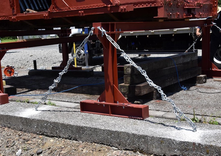架台高さは1.2mあり、枕木厚さは1本14cmなので、両端を交互に吊り上げを数回繰り返す地道な作業です...