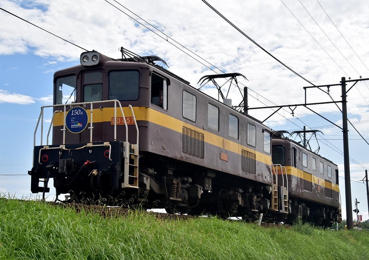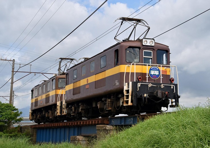 記念ヘッドマークは2種類各1枚で、重連機関車の前後に装着します。