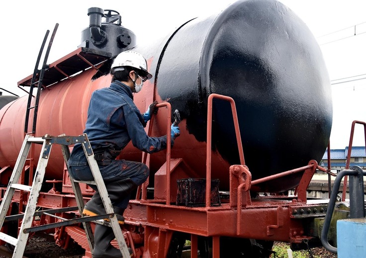 修復作業はタンク車の塗装を進めています。塗装のボランティアスタッフ募集中です。汚れてもよい服装、マスク・ヘルメット・ゴーグルをご持参の上、受付へお申し出ください。(雨天中止)