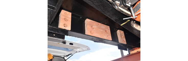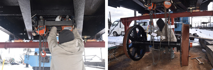 車体床下に架設梁を取付て、車輪を吊るためのチェーンブロック2基を設置します。