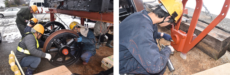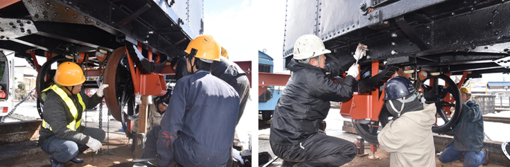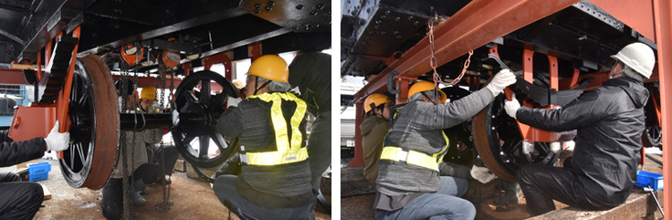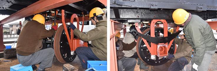 続いて、軸箱守と担弾機が側梁にセットできたら、油圧ジャッキで微調整しながら、ボルトを通して締めていきます。