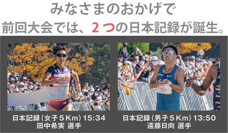 昨年大会では、女子は2006年、男子は2007年以来更新されていなかった5Kmの日本記録2つが更新されました。また、皆様にご協力いただいたクラウドファンディングでは500万円ものご支援金が集まり、日本陸上の中・長距離界における課題であったアスリートへの金銭的な支援も行うことができました。皆様のあたたかいご支援に心よりお礼申し上げます。