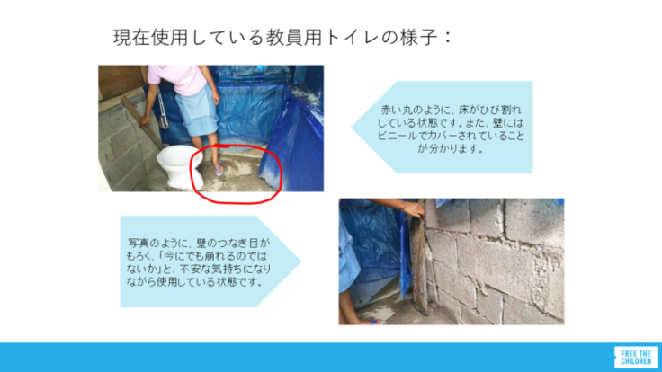 こんにちは。ジョンリー・バリナンです。小4です。学校にトイレがないため、いつも家に帰らないといけないので、授業に着いていけず、本当に困っています。学校にトイレがあれば、すぐに用を足して教室に戻れるのでとても助かります。