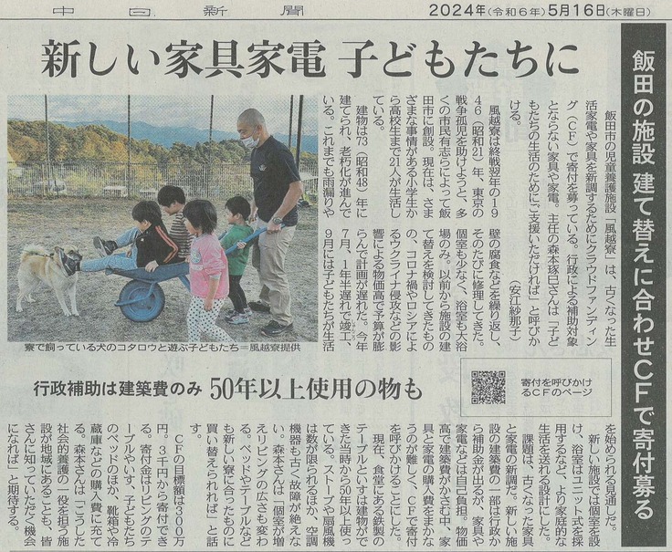 主任の森本です。昨日、中日新聞の記者さんの取材をお受けして、早速今朝の新聞に載せていただきました!地方版のトップに大きくカラーで取り上げてもらいましたが、この記事がきっかけで朝から寄付の申し込みをいただいたり、電話でのお問い合わせをいただいたりしました。反響が思った以上に大きく、何よりありがたかったです。まだまだこのチャレンジを伝えきれていないことを実感しましたので、明日以降はチラシを配るなどもっと精力的に展開できたらと思いました。記事を見てご支援くださった方々、あらためてありがとうございました!