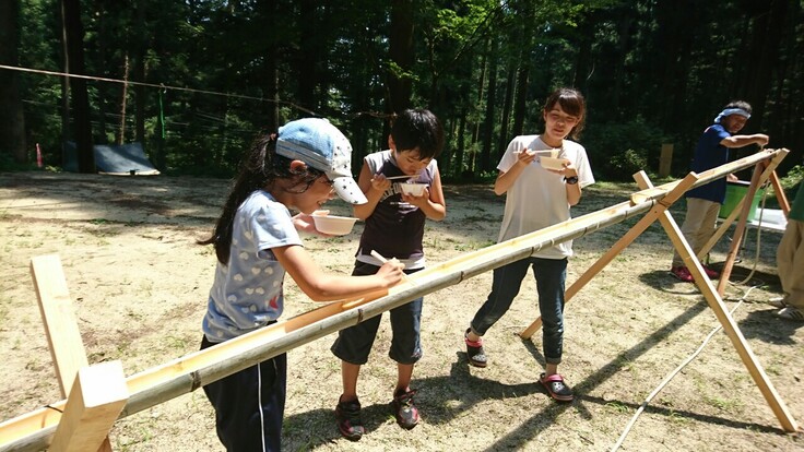 こちらは、夏行事のイベントで飯田ロータリークラブの皆さまと寮のこども達が一同に集まって流しそうめんをした時の写真になります。クラブの会員さんがそうめんの流し台を手際よく作ってくださり、こども達は炎天下のもとで冷たい流しそうめんを何度もすくっておいしく食べることができ、大満足のイベントでした。