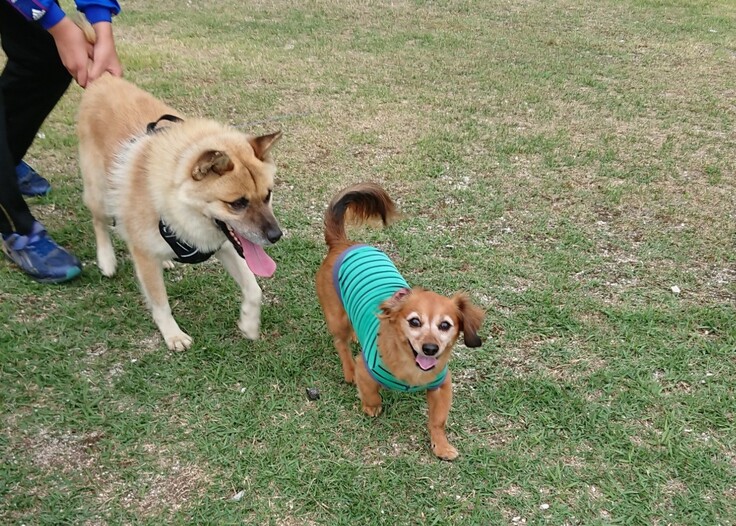 時々、コタロウのお友達が遊びに来てくれます。この時は綱を外してもどこにも行かずじゃれ合って散歩しています。2匹でいればパーッと逃げ出さずにちゃんと飼い主のそばにいるので、何とも不思議な光景です。
