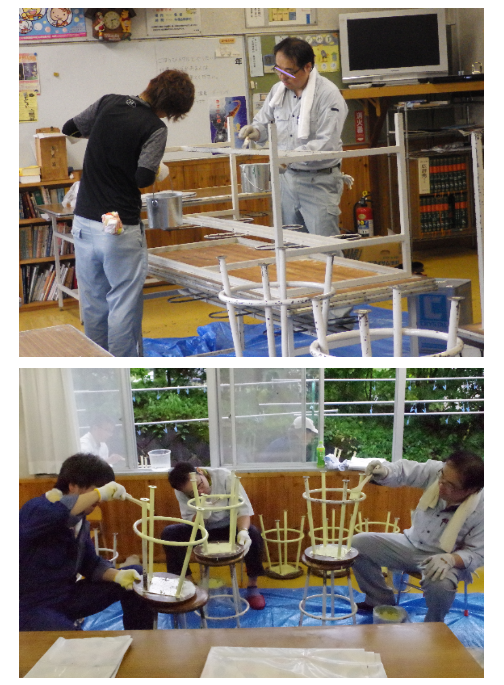 現在の寮舎は昭和48年につくられたもので、築50年を超える建物になります。その当時から使われていた食堂のテーブルや椅子も、鉄製でとても丈夫ではありますが、年月とともにネジが緩んでグラグラしたり色落ちや錆が目立つようになっていました。毎日使うものですのでぜひ大切に使いたいのですが、毎年ボランティアに来てくださる建築士会飯伊支部の方々が、明るい色に塗り直してくれたり、緩んだネジを締め直して調整してくださって、今にいたっています。