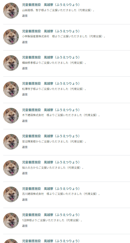 もちろん、画面上の仕組みで代理支援が続けて表示されるようになっているのですが、直接風越寮までお越しいただいた方も少なからずいて、そういう方は何かしら寮に対する熱いメッセージも残してくださいました。いわく、社会的養護のお世話になったことがありました、友人が風越寮に勤めていたことがきっかけでした、飯田で亡くなった母親に出来なかった恩返しをしたくて寄付しました…。直接お話を伺うので、寄付に至った経緯を本当に熱心に話してくださるお姿がどの方も印象的でした。