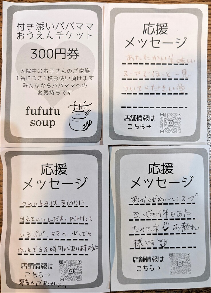 利用してくださる付き添い中のパパママはおうえんチケットの仕組みを喜んでくださっていて、みなさんおうえんチケットをご利用いただき300円引きでご購入いただいています。パパママ以外の利用者さんはスープを買っていただいた上におうえんチケットも買ってくださる方がたくさんいます。