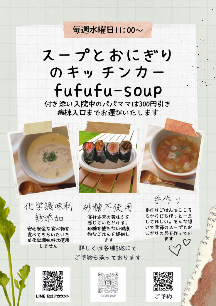 また、2022年10月より付き添い中のパパママと医療スタッフを応援するキッチンカー「fufufu-soup」の運営を始めました。今回はこちらの「fufufu-soup」の活動についてご支援を賜りたく存じます。