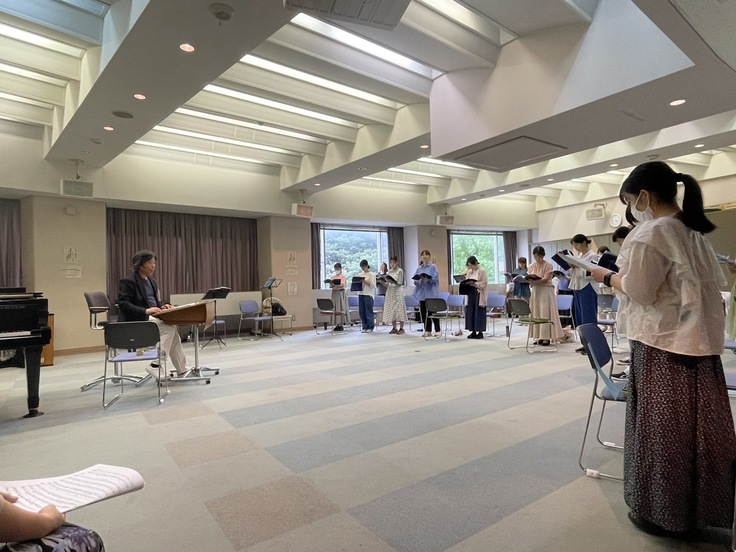 山形大学混声合唱団とアンサンブルbelle、二つの合唱団の声が重なり、ブレンドしてふんわりした表情豊かな響きになりました。永友先生のご指導に、声と音楽がみるみる変わっていく瞬間が何度も何度もありました。永友先生の指導や伊藤先生のピアノを見聞きしているだけでも勉強になることが山ほどあります。