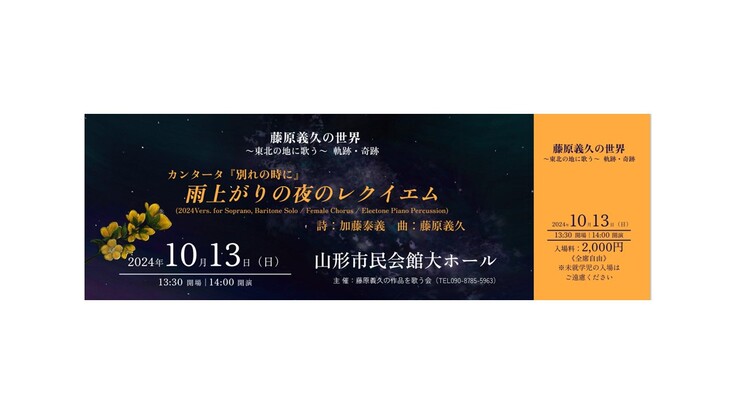 10月13日(日)の演奏会「藤原義久の世界 〜東北の地に歌う~ 軌跡・奇跡」のチケットを7月12日から販売しております。