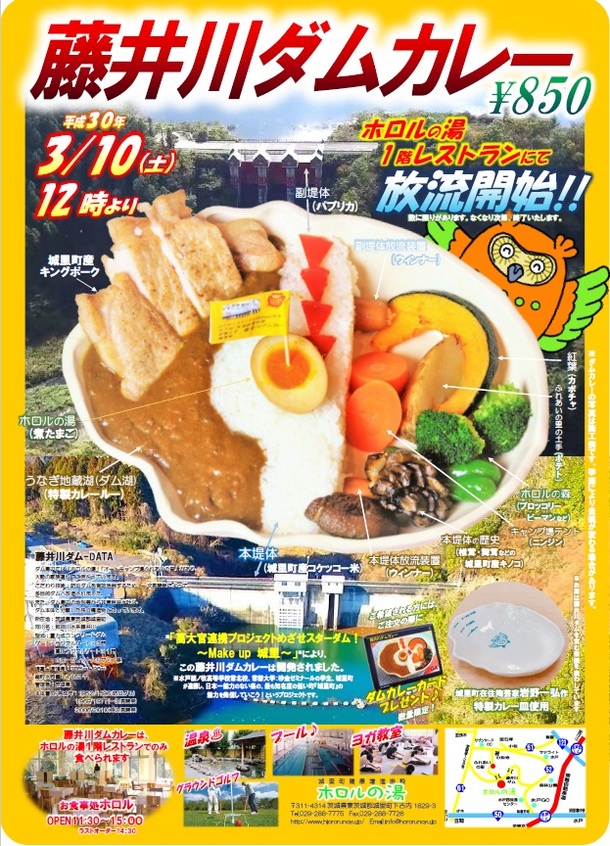 すでにお伝えしたとおり、皆様の温かいご支援により完成した「藤井川ダムカレー」が、3月10日(土)12時00分より城里町健康増進施設ホロルの湯にて販売を開始します! 詳しくはこのページの下のポスターをご覧ください。
