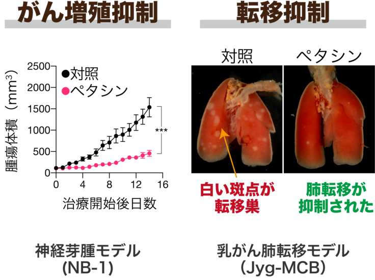 私たちは、ペタシンが将来的に副作用の低い抗がん・転移阻害剤となる可能性を秘めていると考えています。