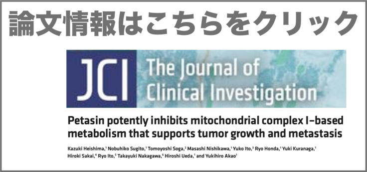こういった特徴をふまえると、低副作用で転移を抑制できる点で、ペタシンは理想的ながん治療薬となる可能性を秘めています。研究成果は、1924年創刊の歴史ある医学雑誌であるJournal of Clinical Investigation誌に認めていただき、論文として発表いたしました。*1
