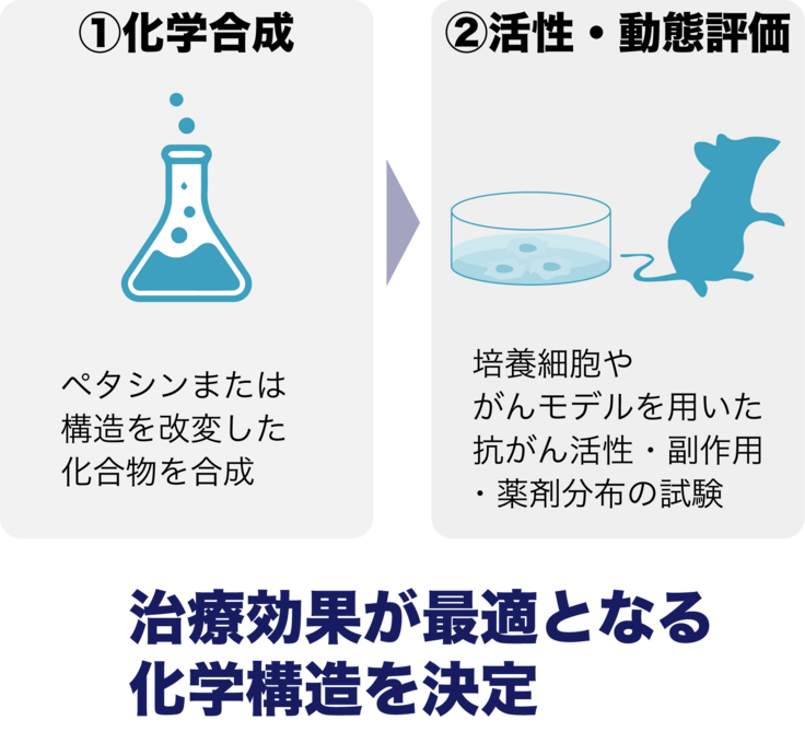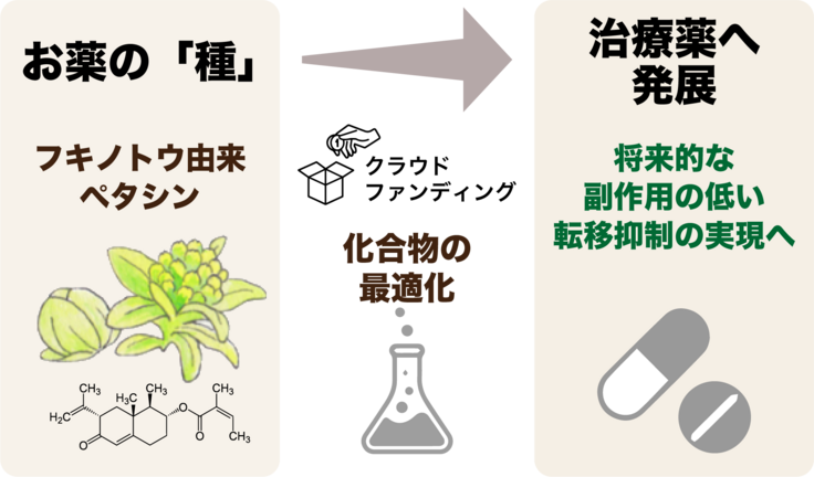 今回はその第一歩として、ペタシンを最適な抗がん・抗転移活性を示す化学構造に改良するための費用を募りたくクラウドファンディングに挑戦いたしました。