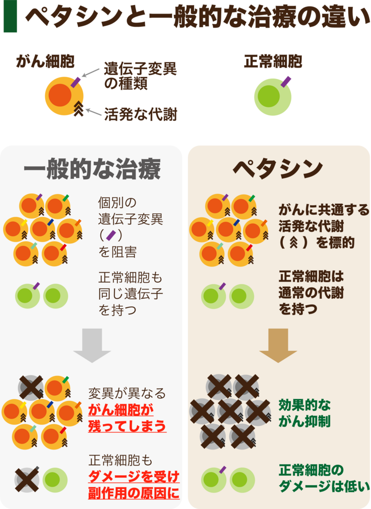 さらに研究を進めたところ、ペタシンはほとんどのタイプのがんが共通して依存している活発な栄養・エネルギー代謝経路を特異的に阻害していることがわかりました。このようにペタシンは、がんが共通して持つ「弱点」をピンポイントに抑える特徴を持っているため、優れた抗がん・転移阻害効果を示していると考えられます。